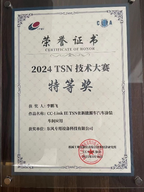 近日,在機械工業儀器儀表綜合技術經濟研究所、CC-Link 協會、中國儀器儀表雜志聯合舉辦的“2024 TSN技術大賽”中,東風專用設備科技有限公司技術團隊以"面向智能工廠的高實時性TSN通信系統"參賽榮獲"TSN應用技術獎",同時團隊成員李鵬飛以全場最高分榮膺"TSN技術特等獎",東風專設團隊成為唯一同時榮獲團體與個人頂級榮譽的企業。